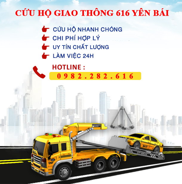 Cứu Hộ Giao Thông 616 Yên Bái xin kính chào quý khách. Chúng tôi chuyên cứu hộ, cứu nạn giao thông chuyên nghiệp nhanh chóng, cung cấp dịch vụ cẩu kéo, vận chuyển xe ôtô, máy nông nghiệp, nhận cẩu và vận chuyển hàng hóa trọng lượng lớn, máy công trình, cây công trình, dựng nhà xưởng. Phục vụ 24/24h các quận huyện tại Yên Bái. Với nhiều năm kinh nghiệm, cùng đội ngũ nhân viên chuyên nghiệp, chúng tôi cam kết mang đến cho quý khách dịch vụ tốt nhất, chi phí thấp nhất. Hotline: 0982.282.616. Cứu Hộ Giao Thông 616 Yên Bái – Đối tác của bạn!